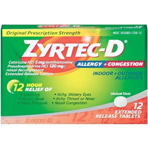 Zyrtec D 5 mg/120 mg Capsule combines cetirizine and pseudoephedrine to provide effective relief from allergy symptoms such as nasal congestion, sneezing, runny nose, and sinus pressure. This combination helps reduce allergy discomfort and improves breathing.